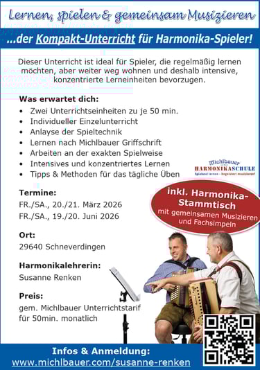 Du möchtest Präsenzunterricht, aber es dir zu aufwändig wöchentlich oder 14-tägig die weite Strecke zu einem Lehrer zu fahren? Dann lade ich dich herzlich zu meinem Kompakt-Unterricht mit Harmonika-Stammtisch in Schneverdingen ein.
