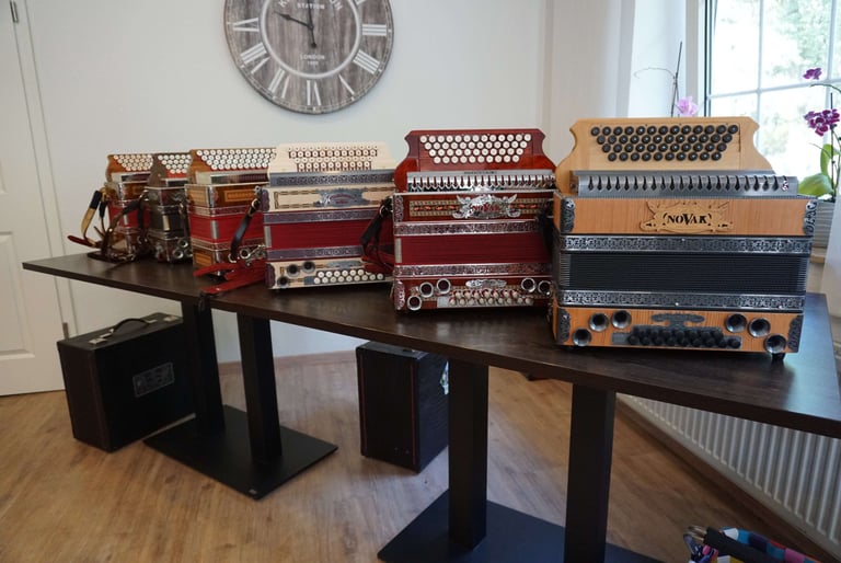 Wir auf der Harmonika sind auf bestimmte Dur-Tonarten eingeschränkt. Spiele ich eine G-C-F-B Harmonika, so kann ich nur in diese Tonarten spielen und nur mit Spielern spielen, die auch eine solche Harmonika haben. Heutige Harmonikas haben manchmal noch zwei weitere Halbtöne, sodass sich der Tonumfang etwas erweitert. Wenn ich auf meiner Harmonika auch Moll-Bässe habe, kann ich auch Lieder in einer Moll-Tonart spielen. Aber auch hier nur die, die zu meinen Dur-Tonarten passen.